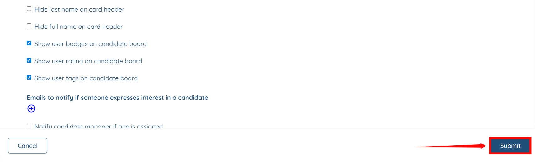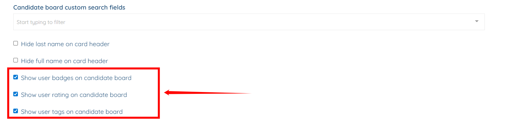 Step 3: Scroll down and select the checkboxes, as shown in the screenshot below, to display the user badges, user rating, and user tags on the candidate board.