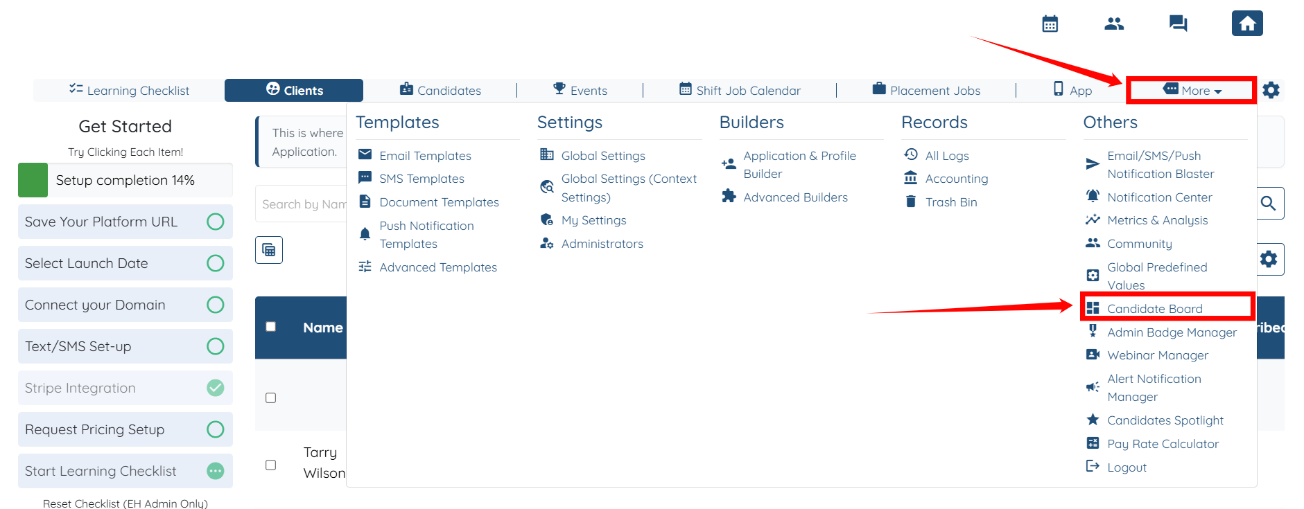 Step 1: Log in to your agent dashboard, then click More and select Candidate Board, as shown in the screenshot below.