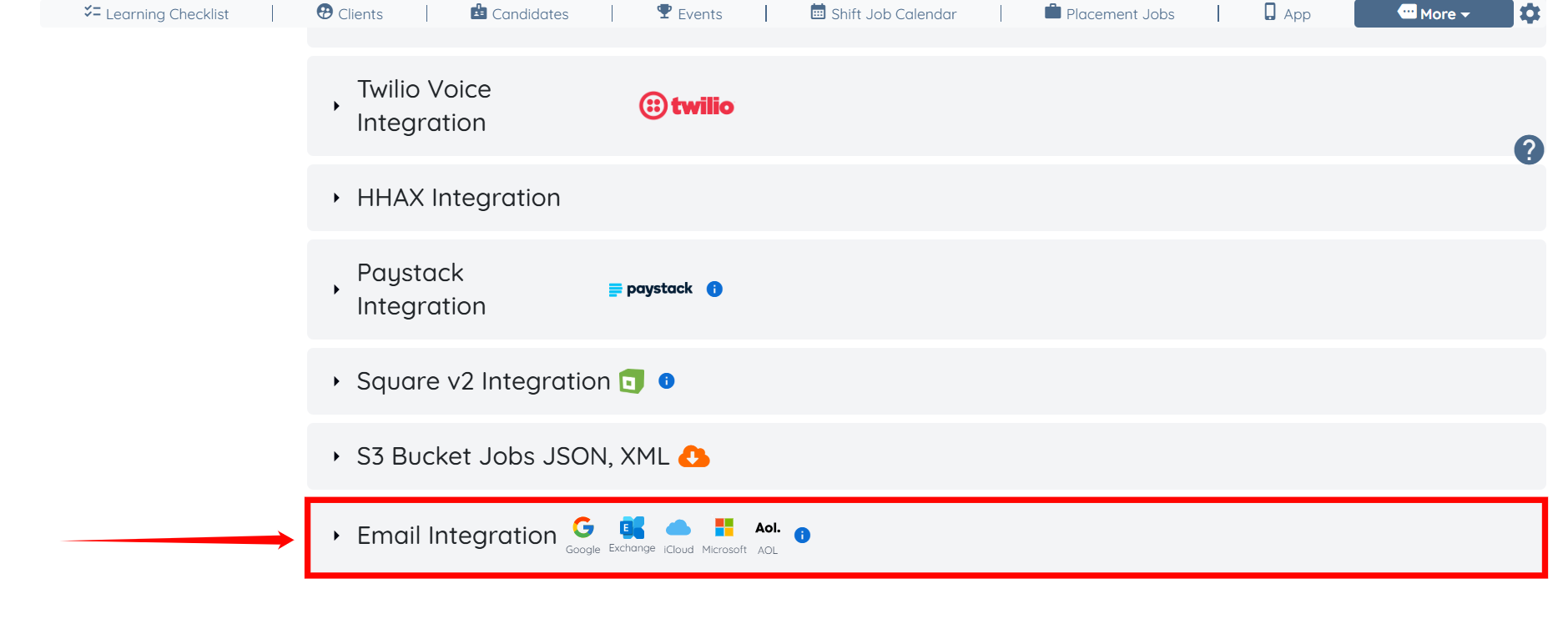 Step 3: Scroll to the bottom of the page and click the Email Integration option to expand its details.