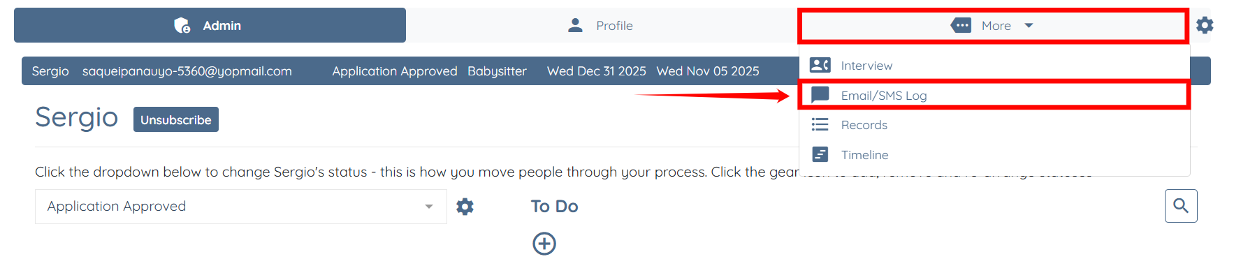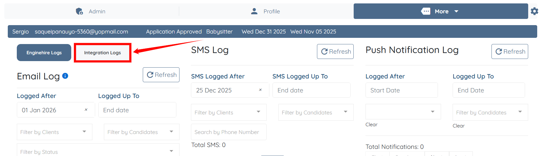Step 10: Click More, then select Email/SMS Log, as shown in the screenshot below.