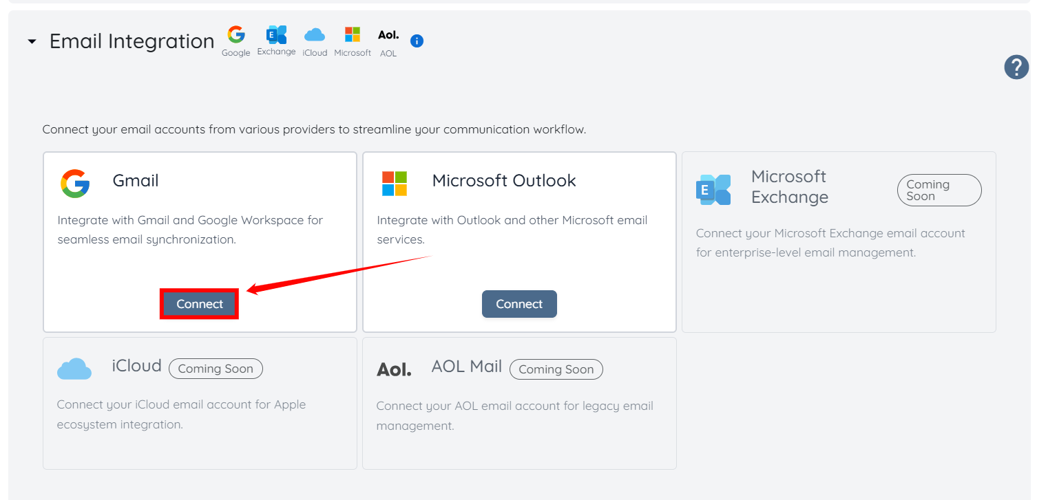 Step 6: Once your email integration request is approved and enabled, a Connect button will appear for the email integrations.