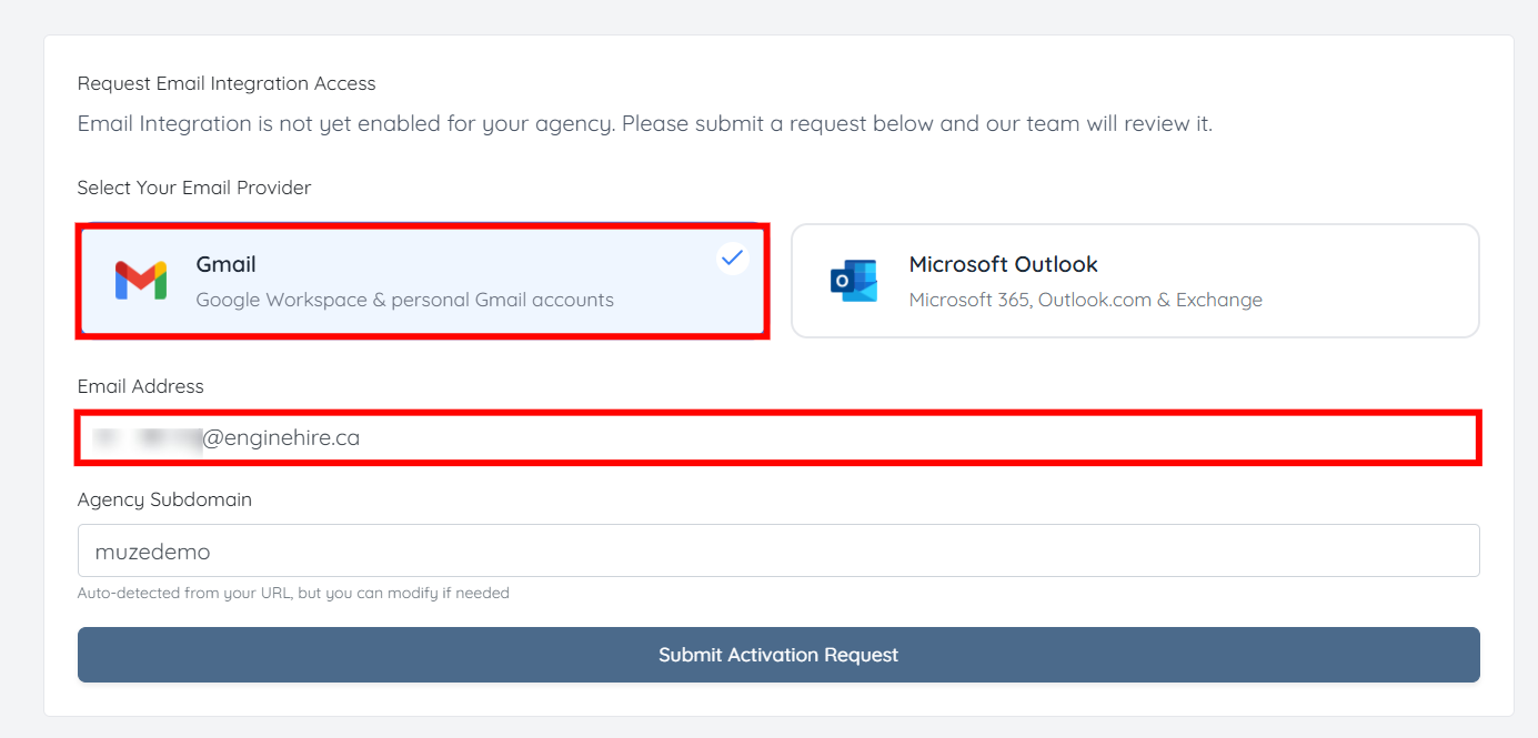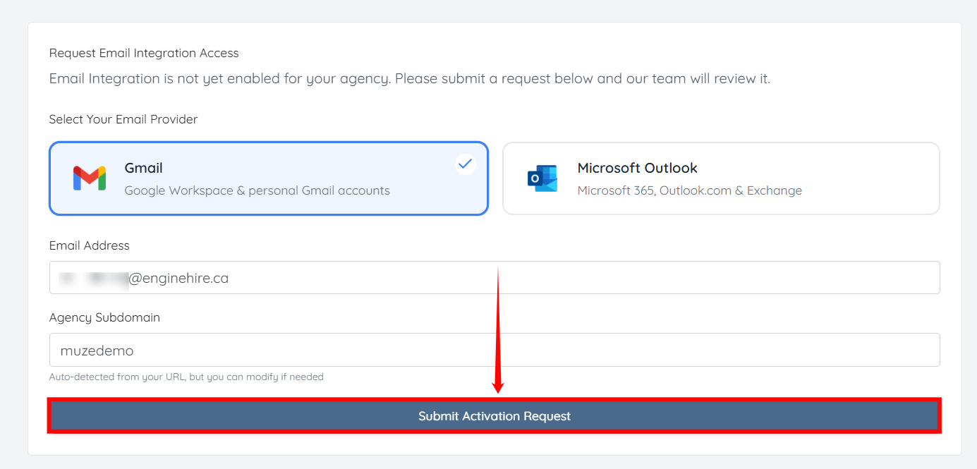 Step 5: Click Submit Activation Request to request email integration access for your agency.