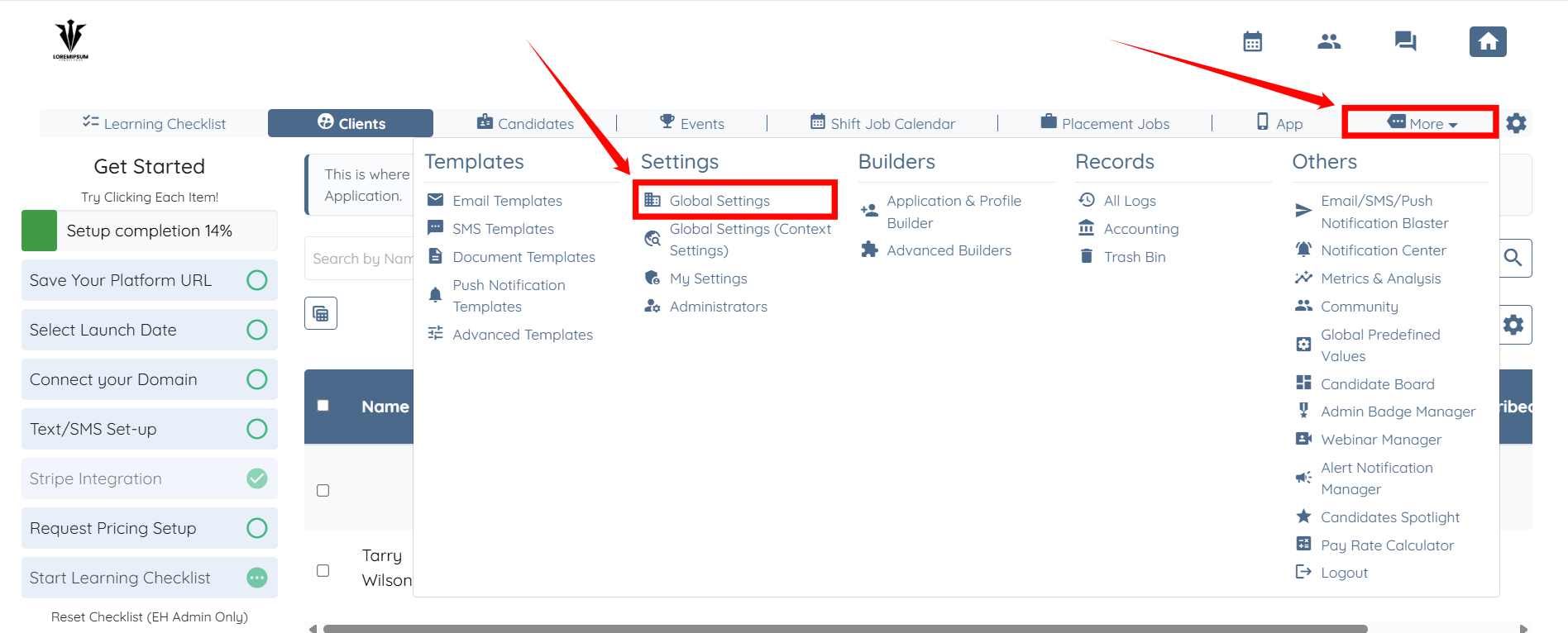Step 1: Log in to your agent dashboard, and click on More > Global Settings as shown in the screenshot below.