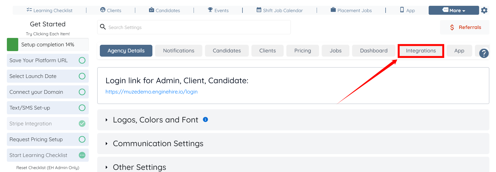Step 2: Click the Integrations tab from all the available tabs.