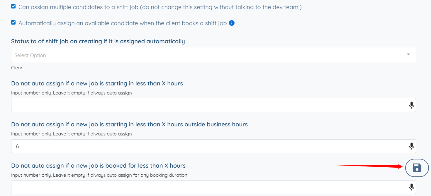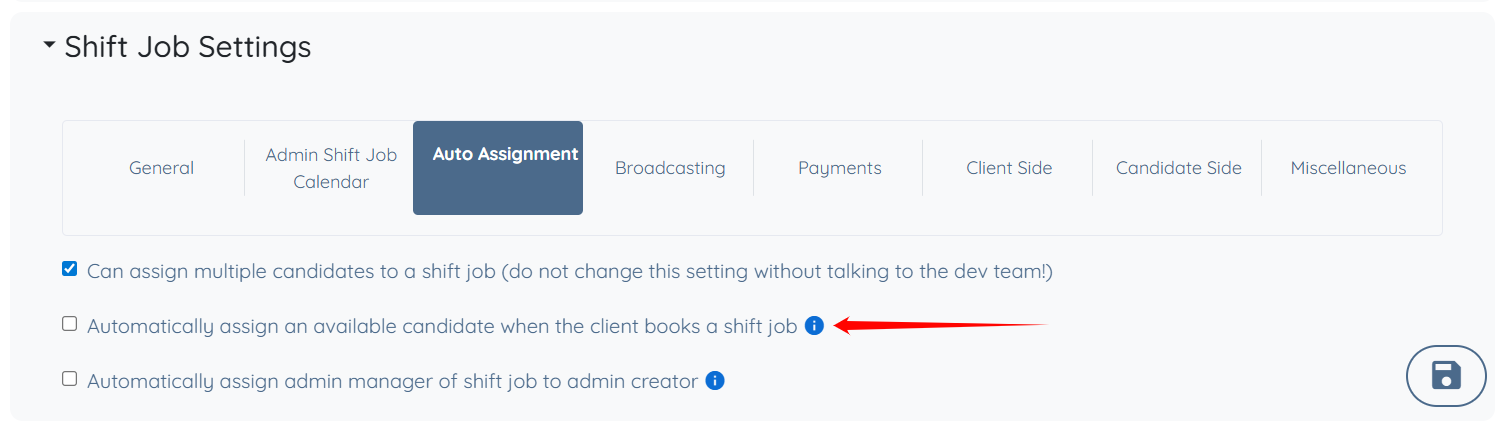 Step 5: Check the Automatically assign an available candidate when the client books a shift job checkbox.