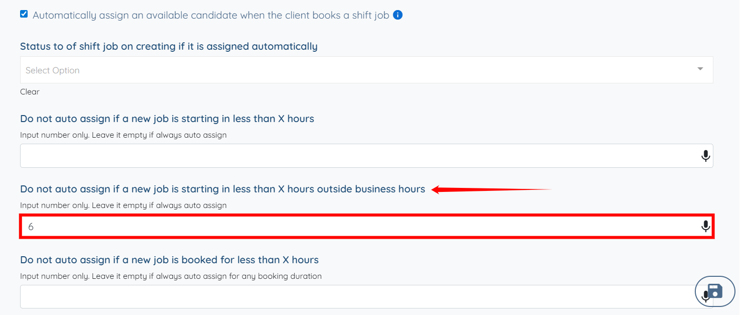 Step 6: Scroll down and enter the number of hours under the Do not auto assign if a new job is starting in less than X hours outside business hours field to define how close to the job start time auto-assignment is restricted.