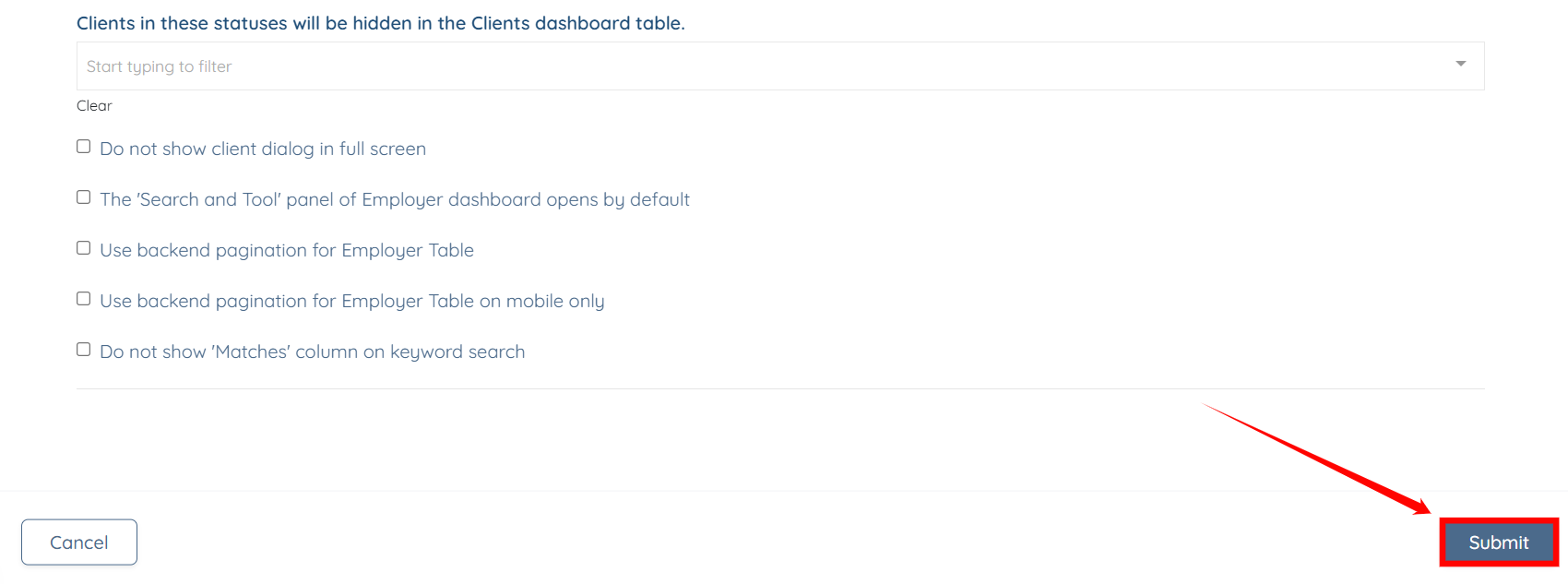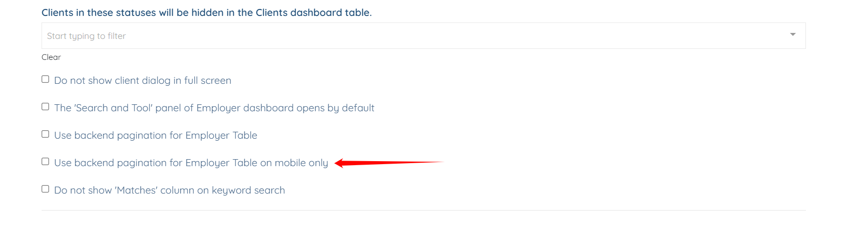 Step 2: Ensure that the Use backend pagination for Employer Table on mobile only checkbox is unchecked.