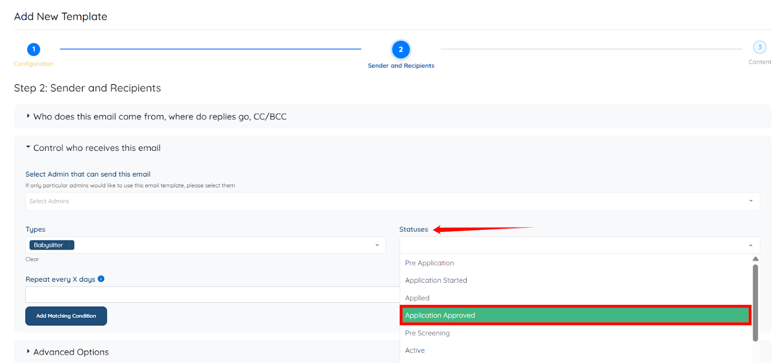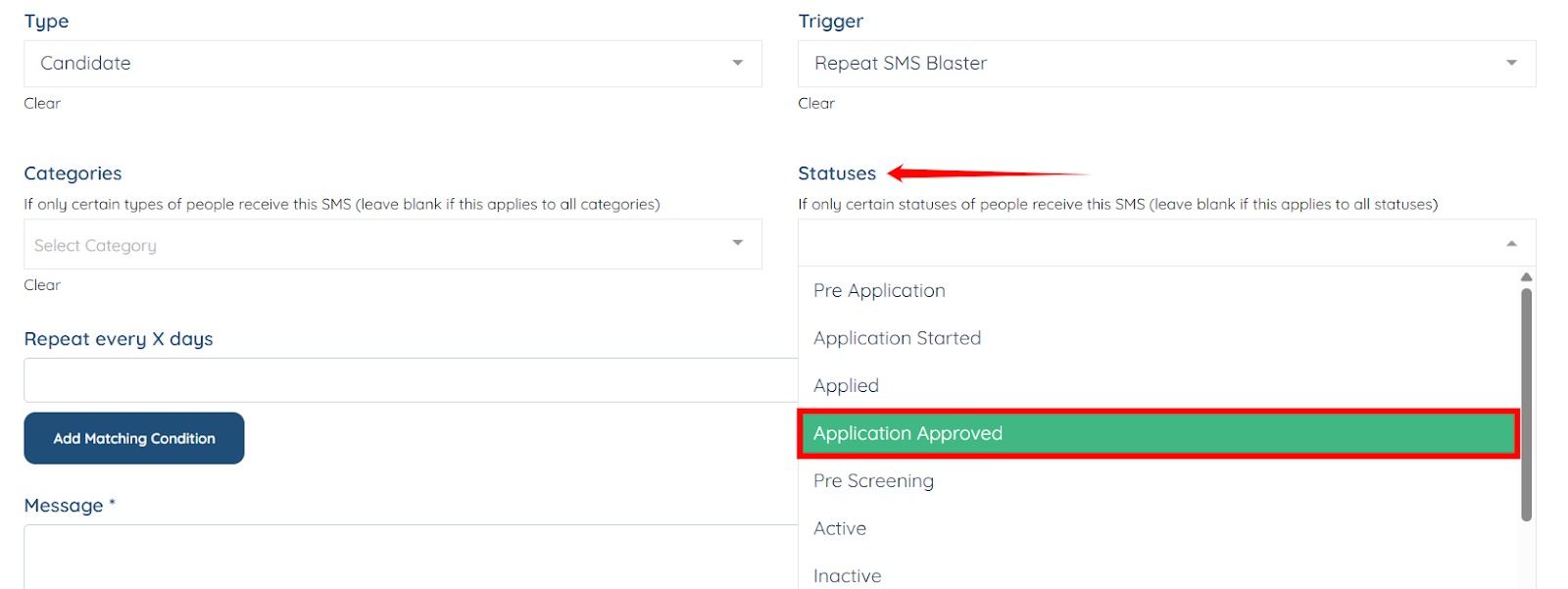 Step 8: Select the statuses within the candidate’s category (chosen in the previous step) to target more specific candidates in that category. For example, Application Approved.