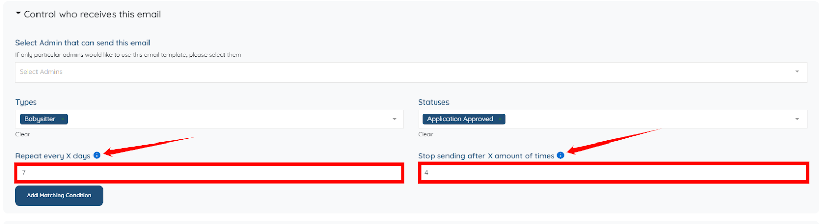 Then, use the Stop sending after X amount of times column to specify how many times the email sends before the schedule automatically ends.