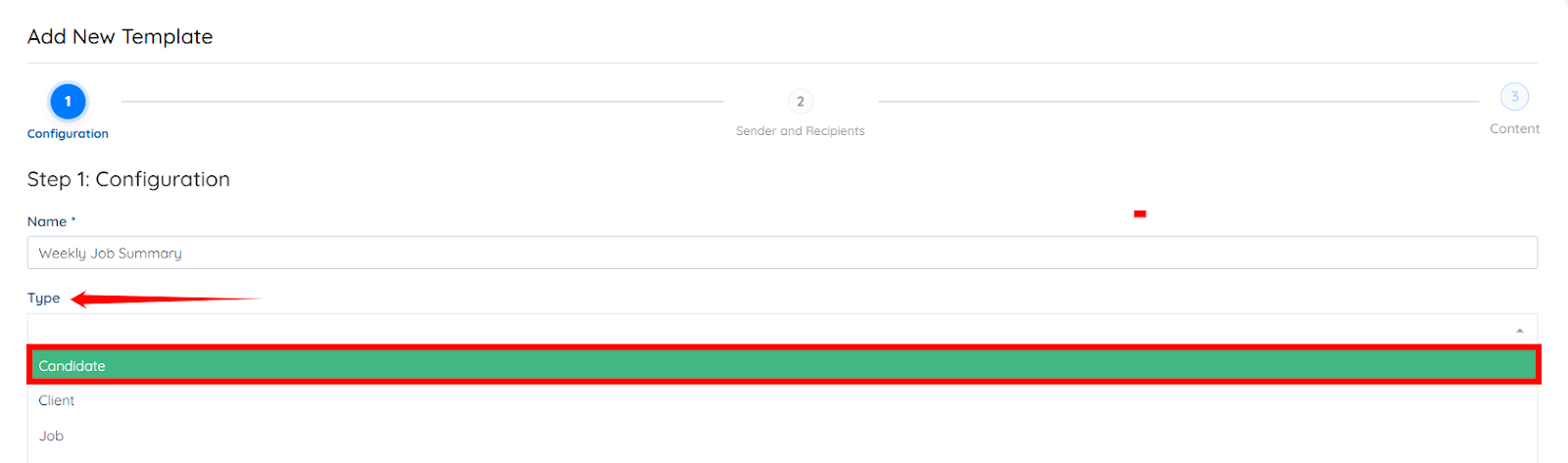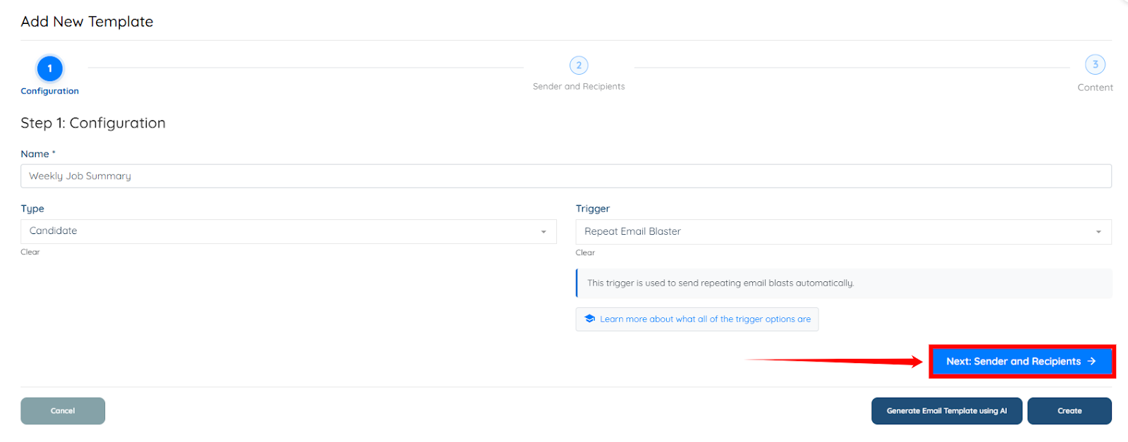 Step 6: Click Next: Sender and Recipients to select the candidate category along with the statuses you want to target in the Email Blaster.
