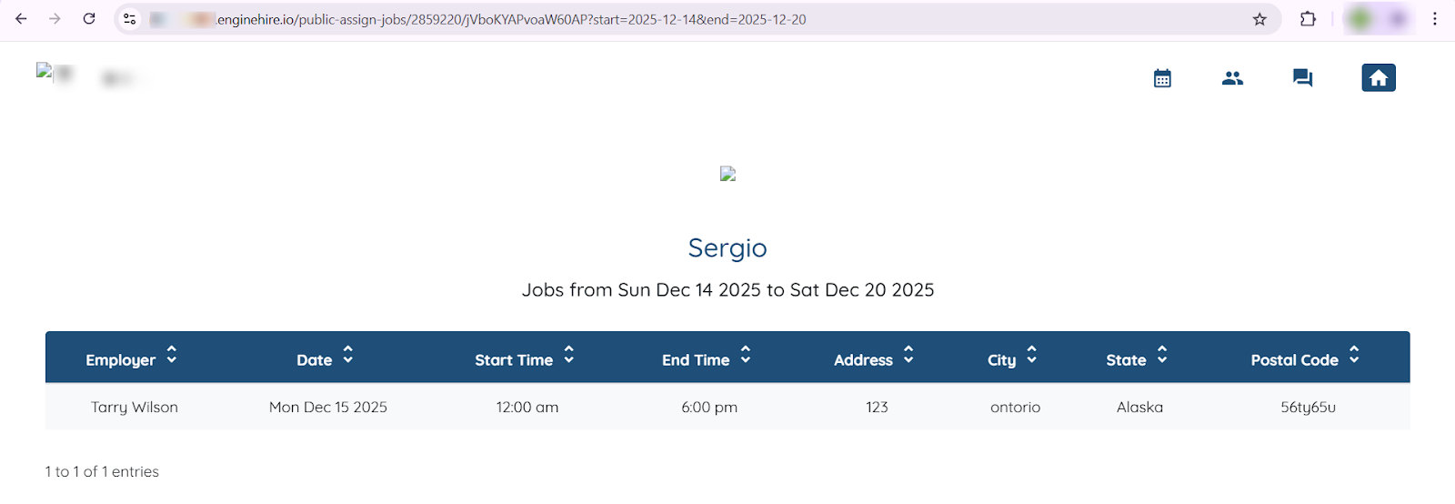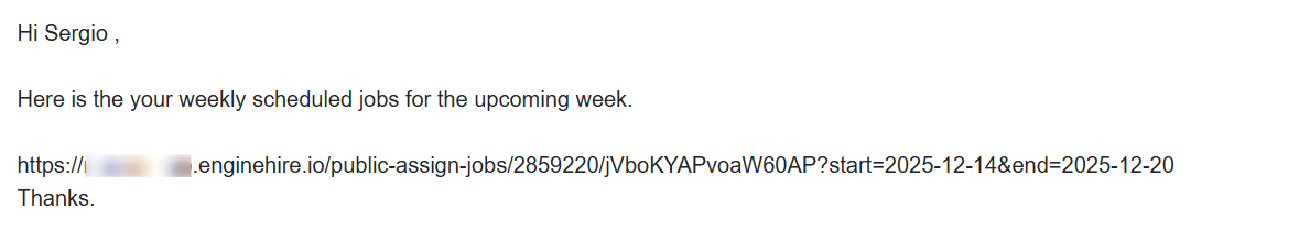 And the weekly calendar link received in the email will display the upcoming jobs for the next week as follows: