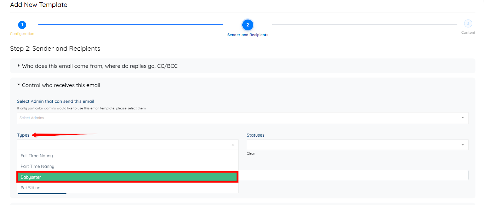 Step 7: Select the type of candidate you want to target in the Email Blaster from the Types dropdown—for example, Babysitter.