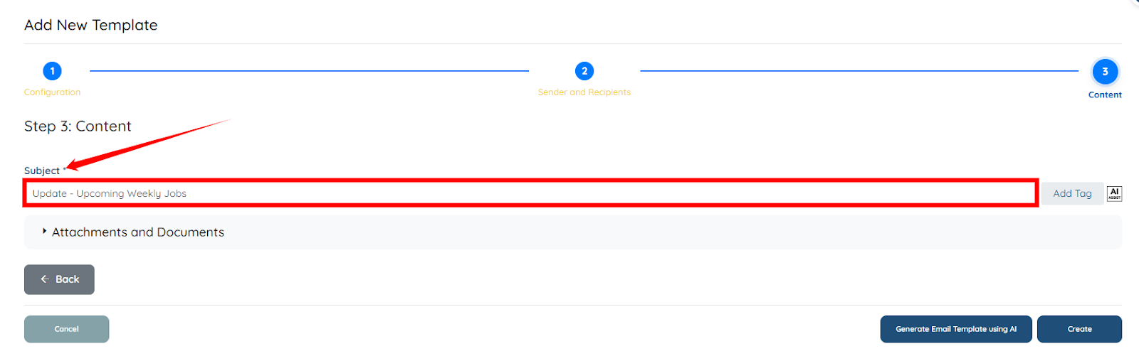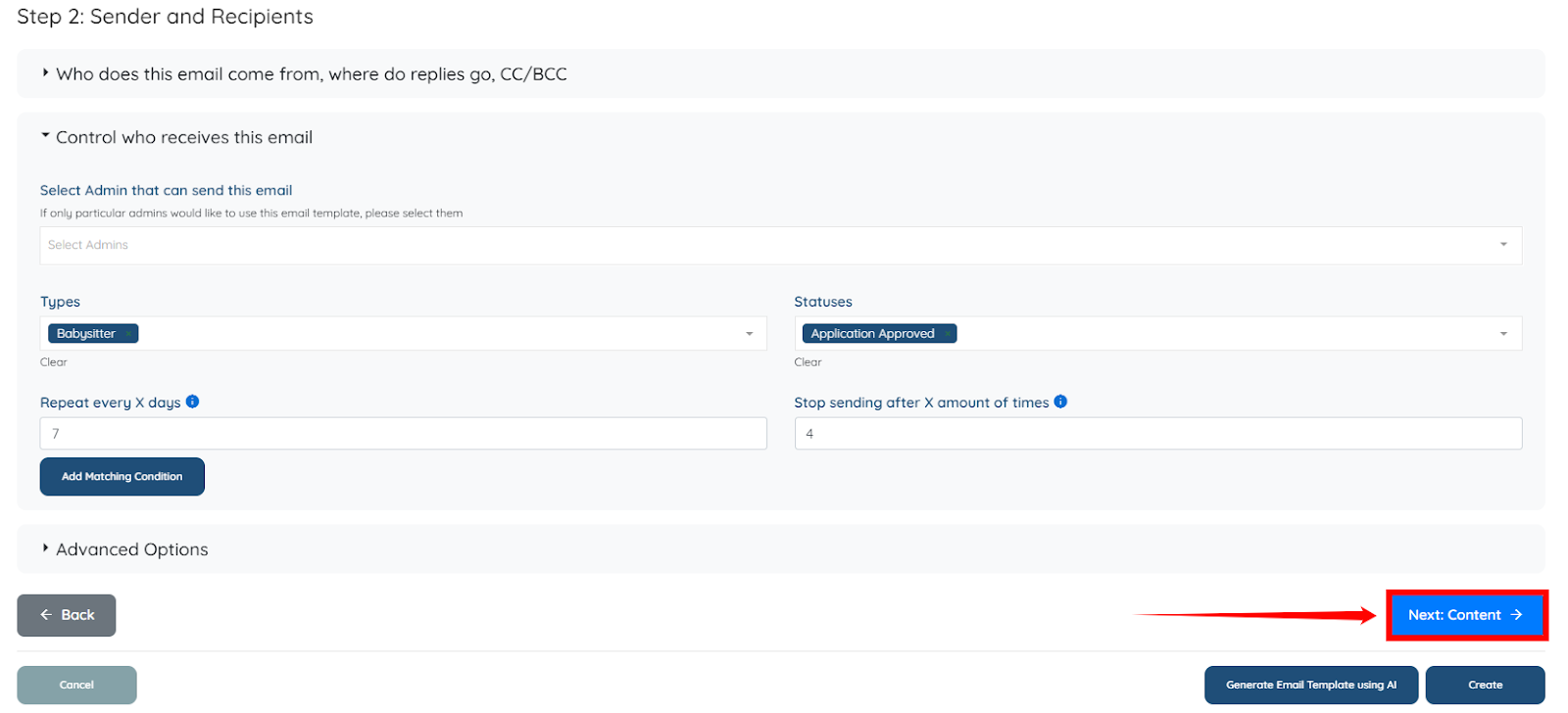 Step 10: Click the Next: Content button to begin preparing the email blaster’s body, which includes all the required information that will be sent to the specified candidates.