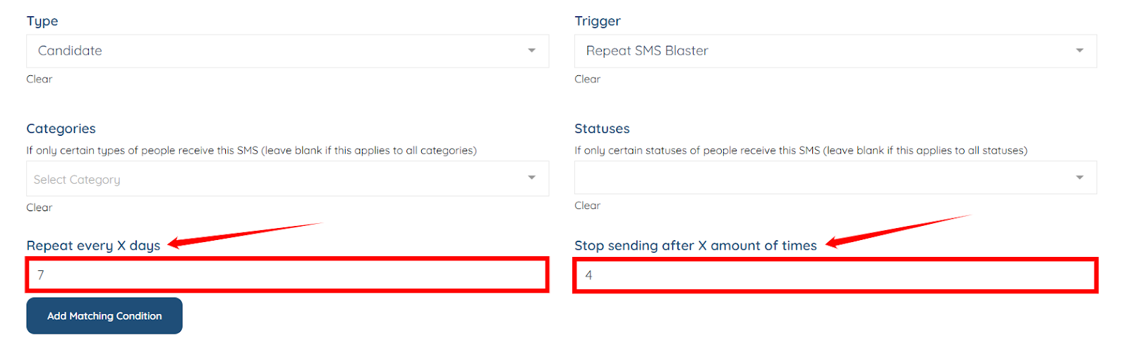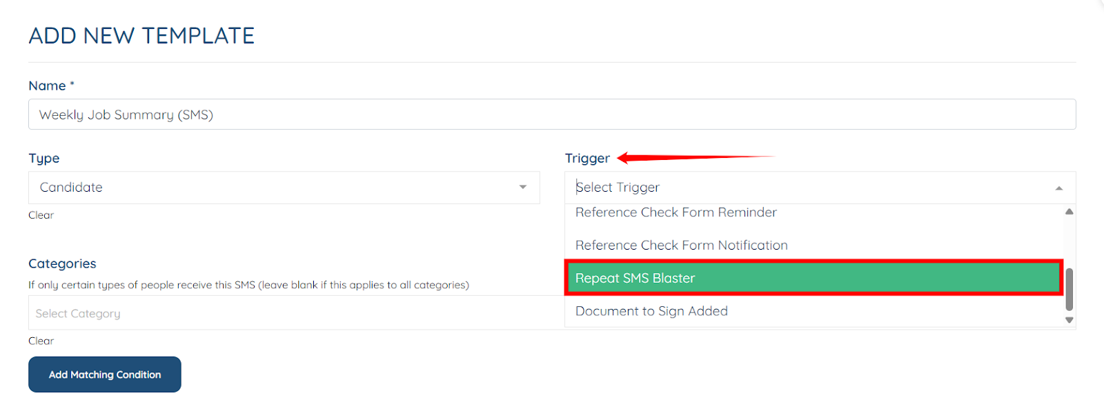 Step 5: Select the Repeat SMS Blaster trigger from the Trigger dropdown.