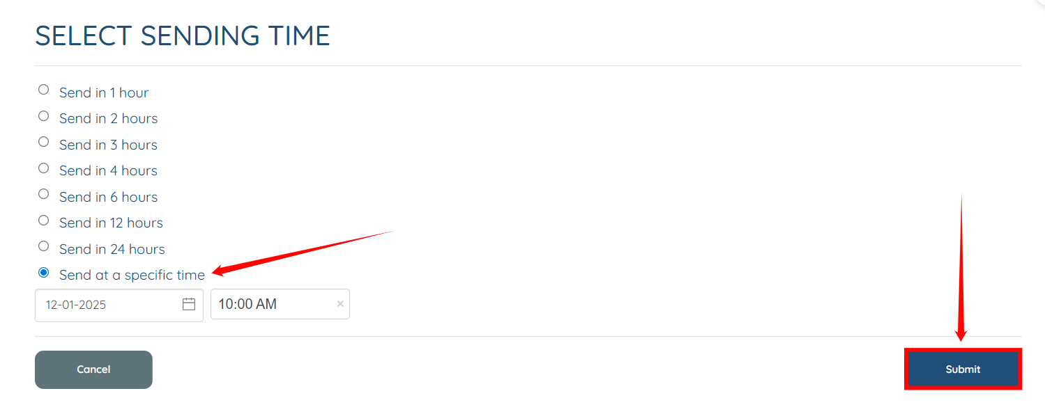 Step 6: Select the Send at a specified time radio button, and then provide the date from which you want to start sending the email to the specified candidates. After that, click the Submit button to proceed.