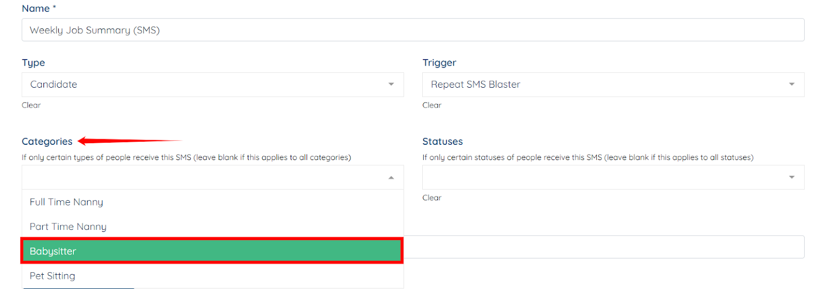 Step 6: Select the type of candidate you want to target in the SMS Blaster from the Types dropdown—for example, Babysitter.