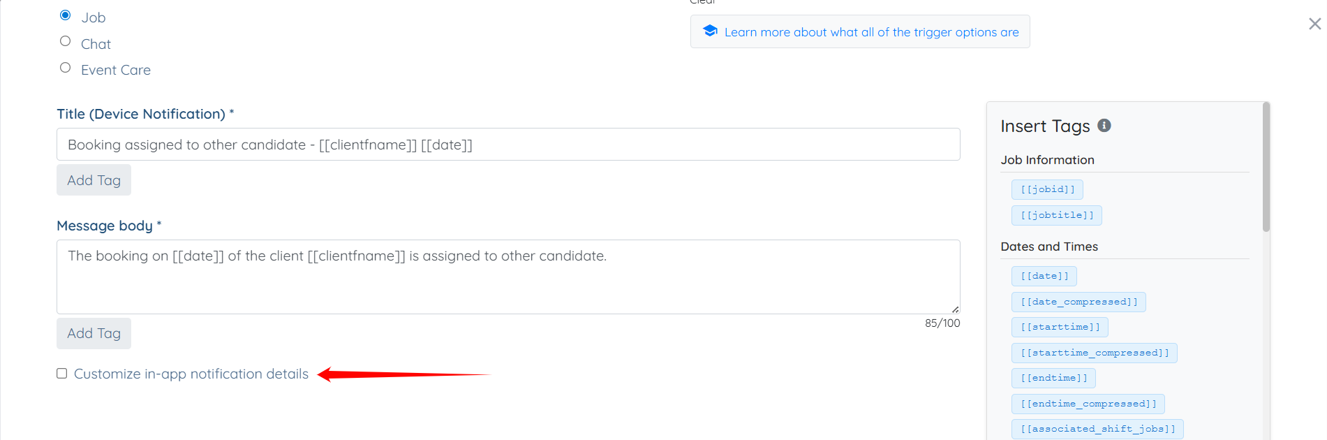 Step 5: You may modify the title and message of the in-app notification as needed by updating the Custom title (In-App Notification) and Custom message body fields.