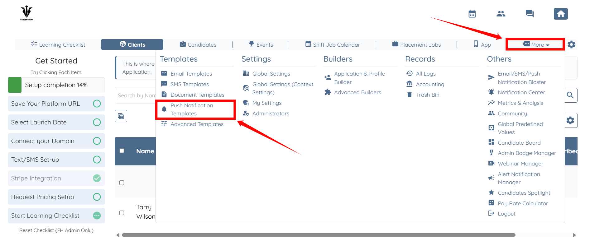 Step 1: Log in to your agent dashboard and click More > Push Notification Templates, as shown in the screenshot below.