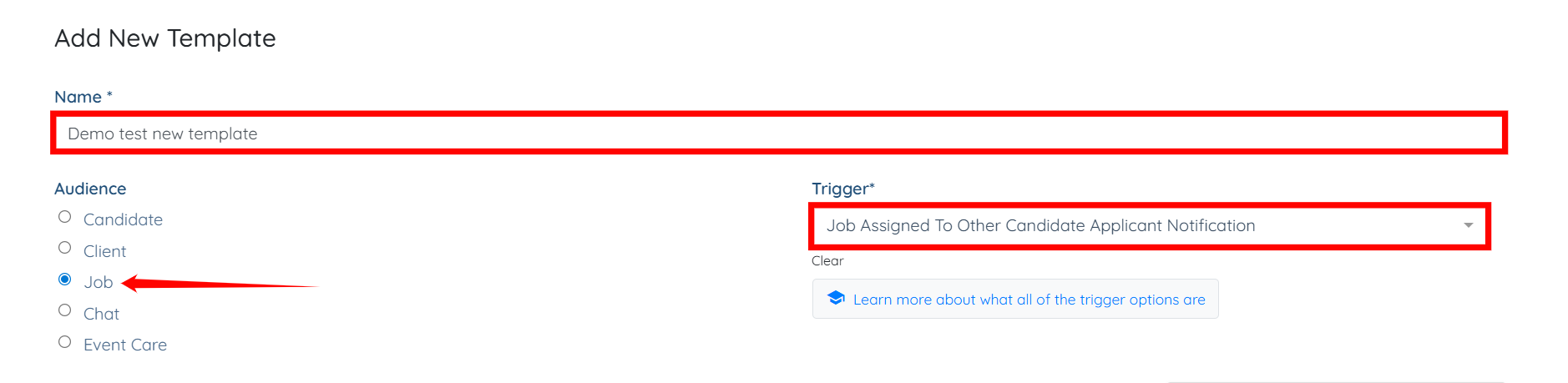 Step 3: Enter a name for your template, select the desired audience type, and then choose the trigger you want to use.