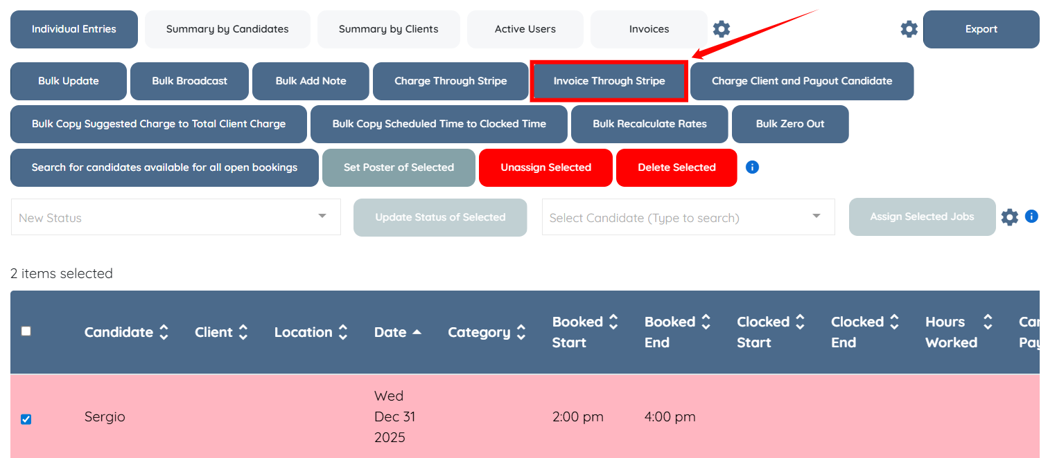 Step 4: Click the Invoice Through Stripe button to generate and send invoices through Stripe for the selected shift job entries.