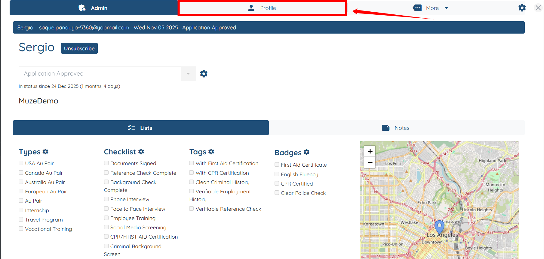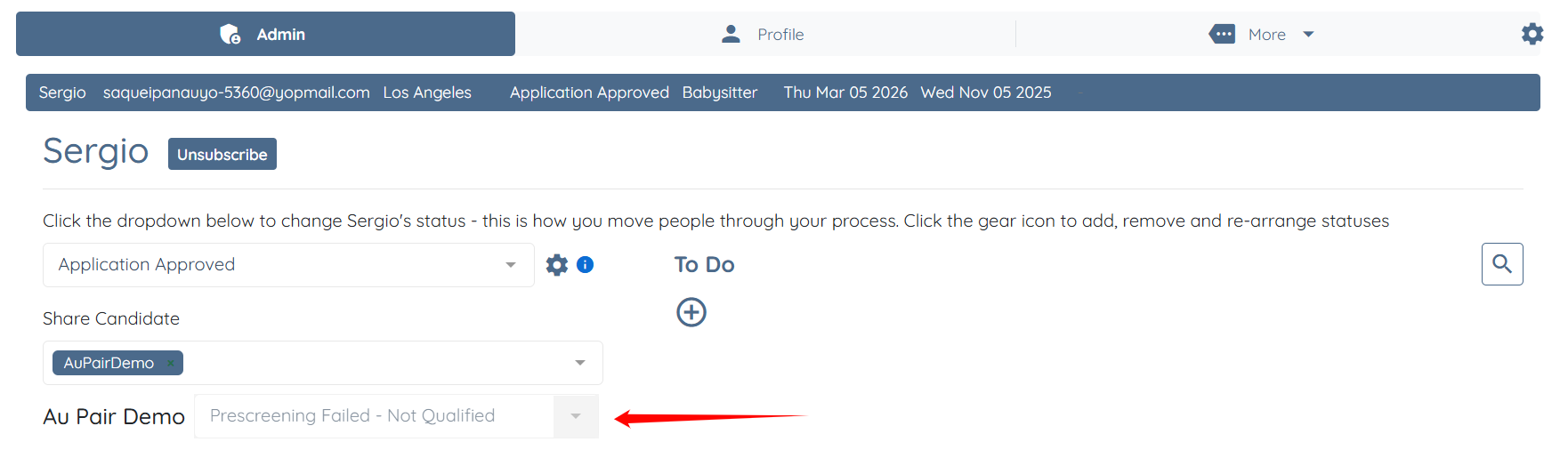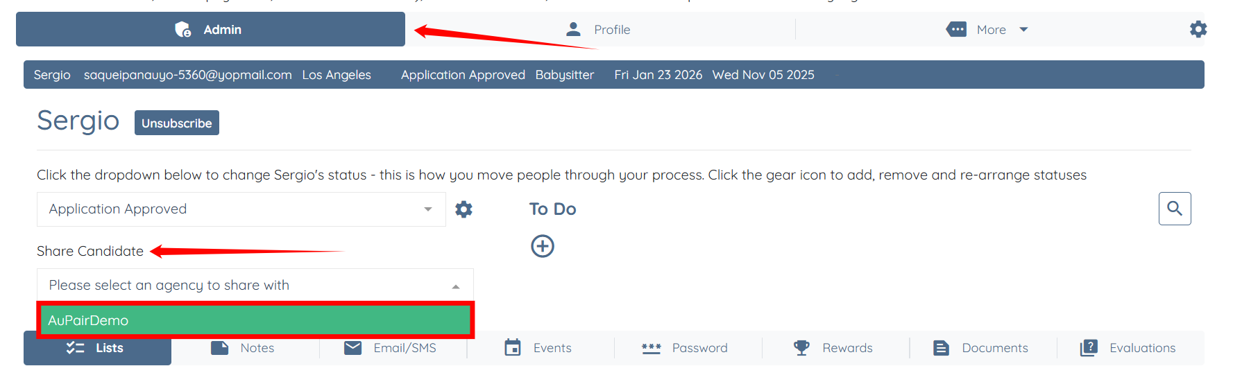 Step 2: Under the Admin tab, select the agency with which you want to share the candidate. In this case, it is AuPairDemo.