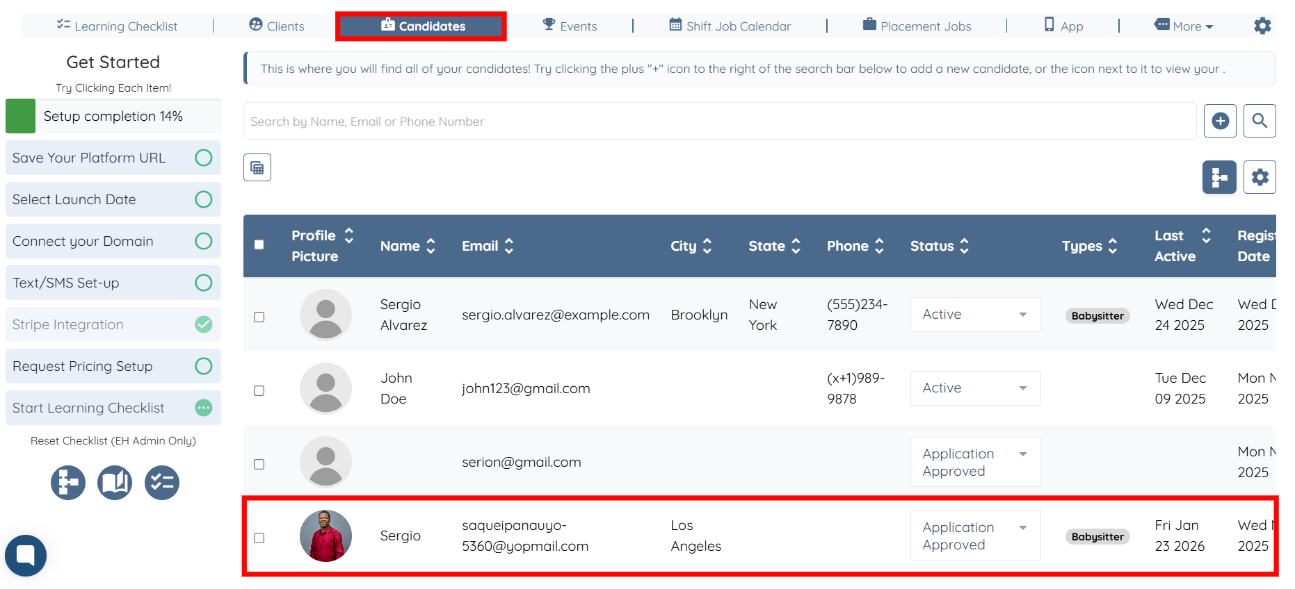 When opening the profile, the receiving agency can see the source agency and the application status assigned by that agency. The receiving agency can also manage the candidate within its own workflow by updating the application status, tags, checklist items, and types without affecting the source agency’s records.