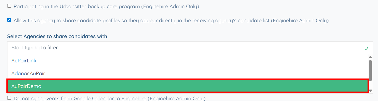 Step 3: Select the agencies you want to share the candidates with. In this case, the selected agency is AuPairDemo.