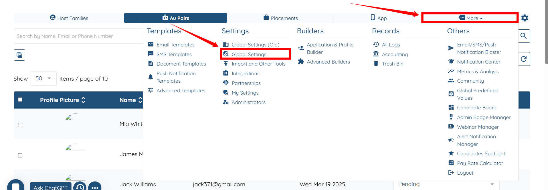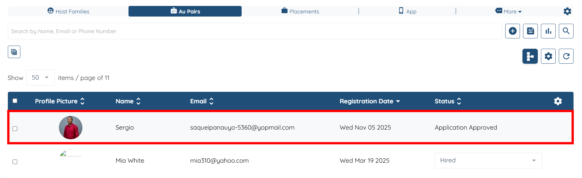 Step 1: Under the AuPairs section, the shared profile appears in the candidates list. Click the profile to open it.