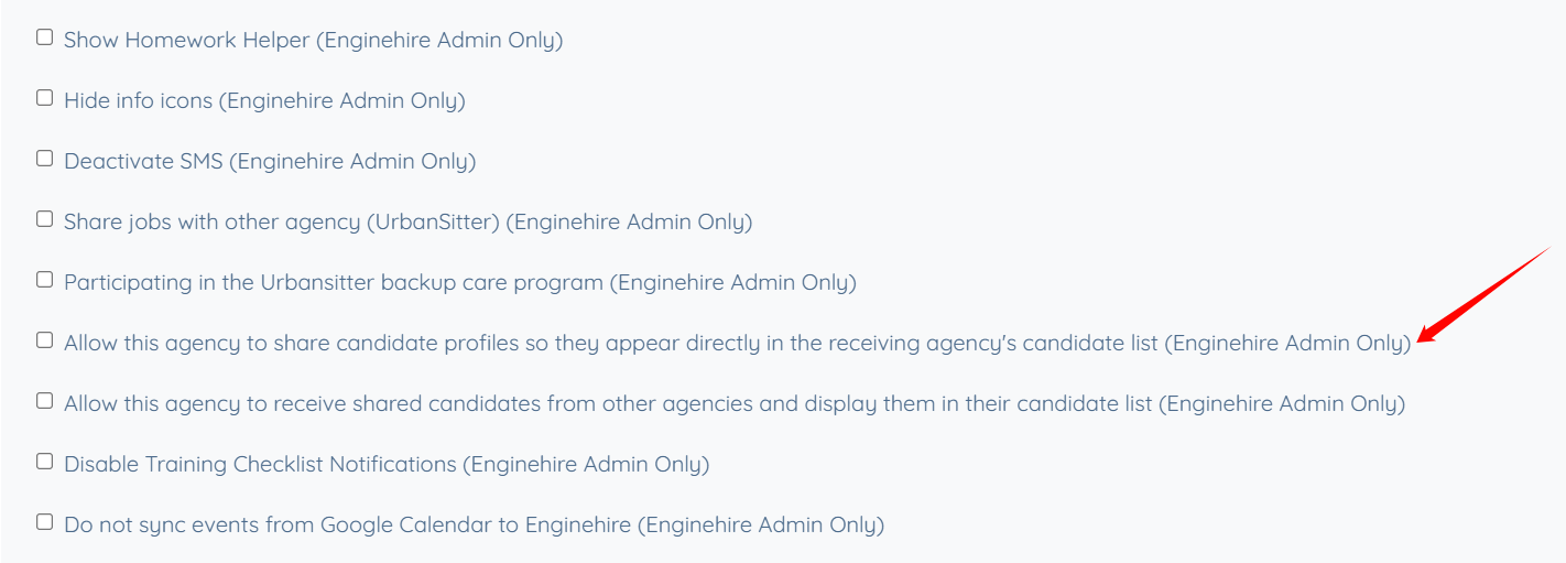 Step 4: Scroll down, then check the Allow this agency to receive shared candidates from other agencies and display them in their candidate list (Enginehire Admin Only) checkbox.