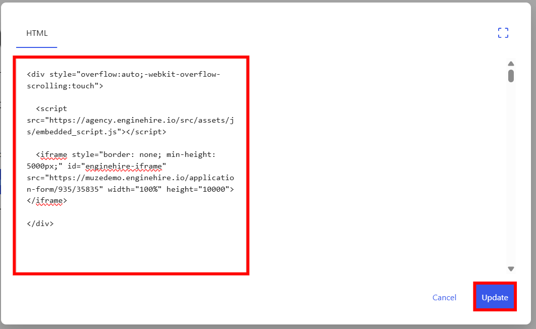 <iframe style="border: none; min-height: 5000px;" id="enginehire-iframe" src="WEBSITEURL (replace agencyname with application-form)" width="100%" height="10000"></iframe>