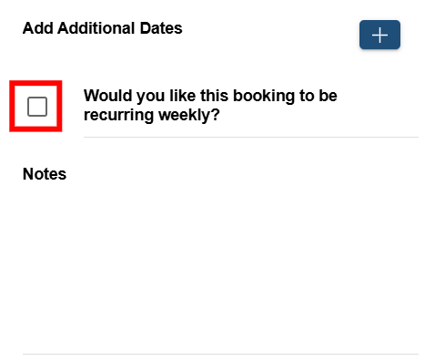Step 6: Check the Would you like this booking to be recurring weekly? checkbox if you want the booking to repeat on a weekly basis.