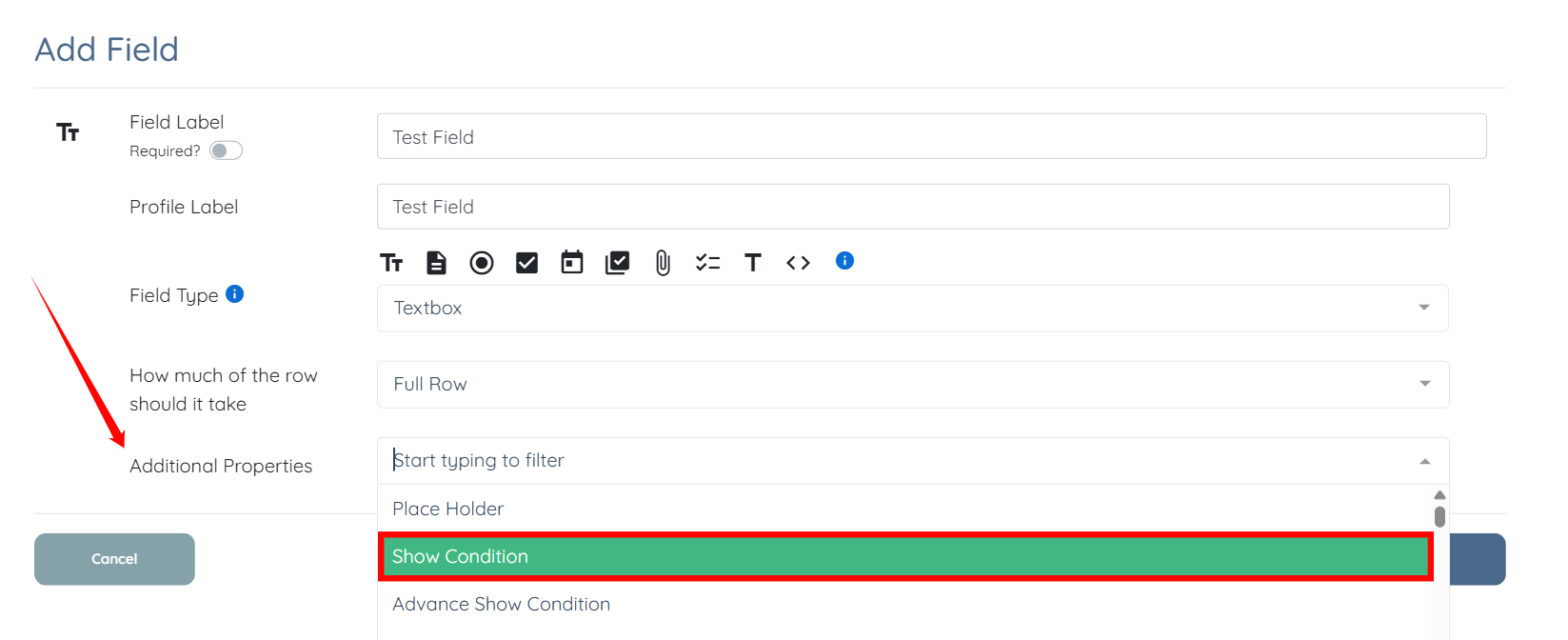 Step 5: Select the required Additional Properties for the field from the dropdown list.