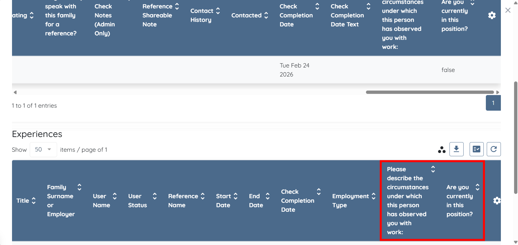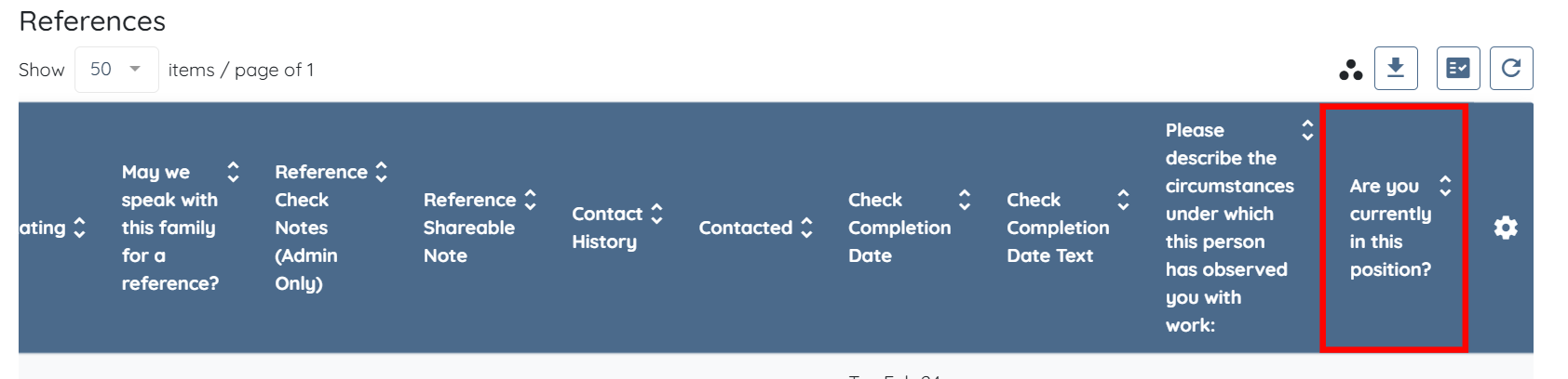 You can also add custom fields from the Employment History section into the references log table. For example, βAre you currently in this position?β