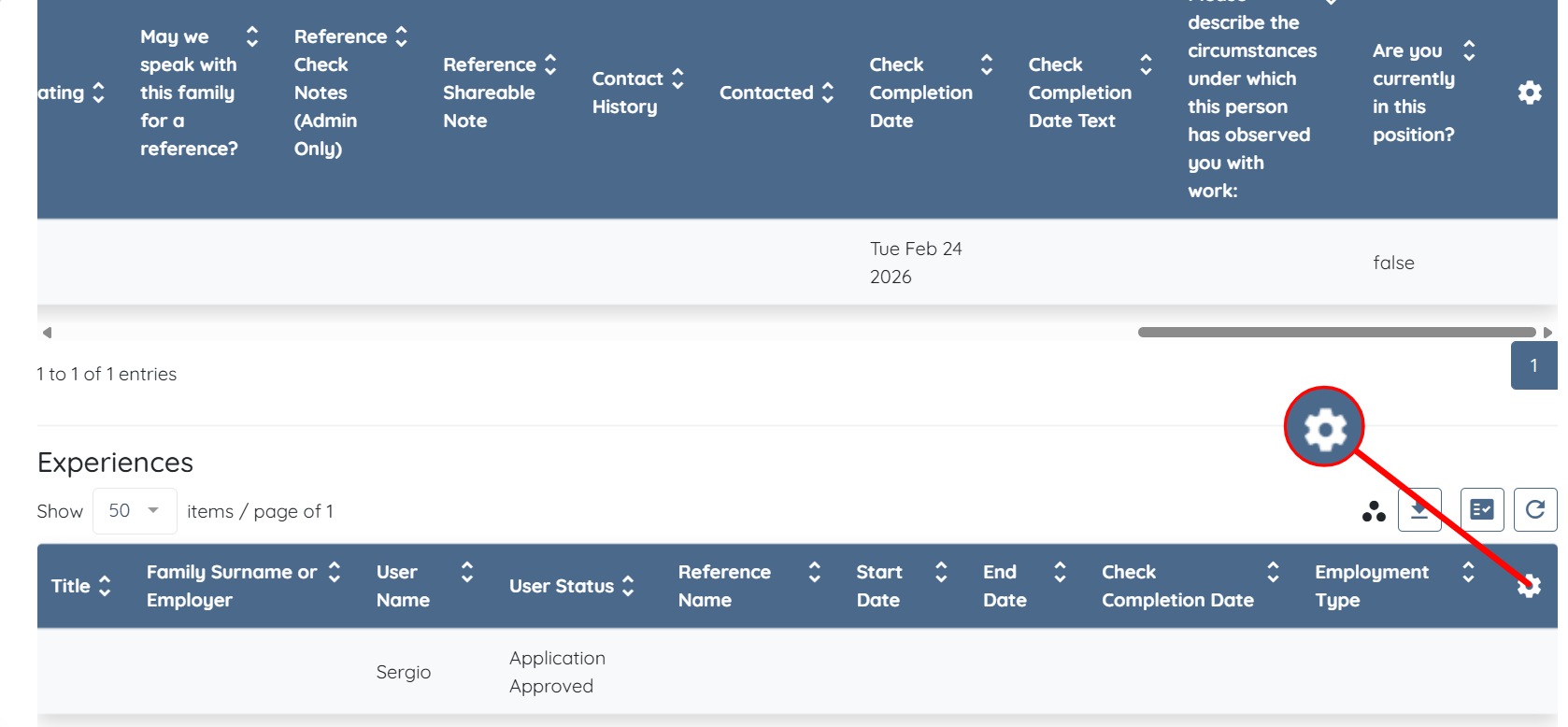 Step 6: To add custom fields to the Experiences log table, click the Gear icon on the right-hand side of the Experiences table header to open the Experience Dashboard Settings.