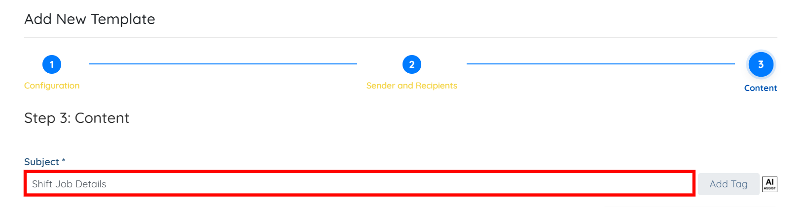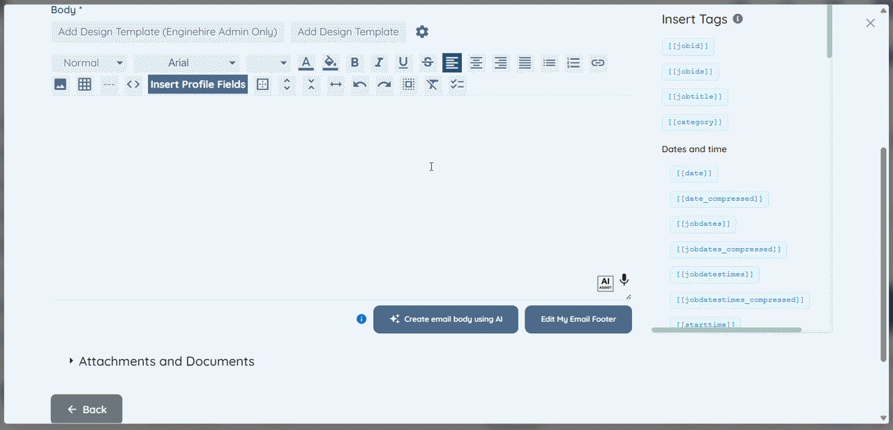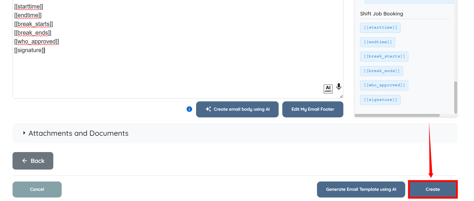 Step 7: Scroll down and prepare the email body by adding the Shift Job Booking tags. To add a tag, click it to copy, then paste it into the email body.