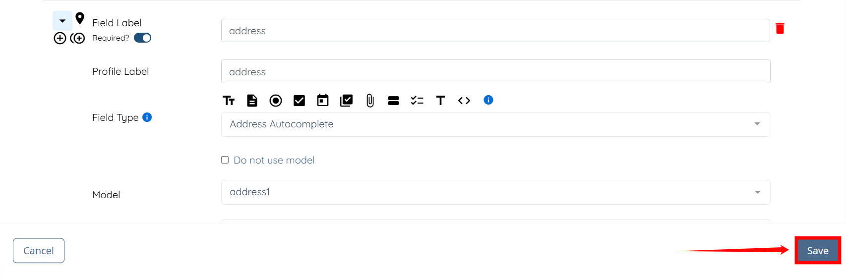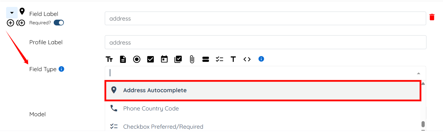 Step 4: Scroll down to the address field and select the Address Autocomplete option from the Field Type dropdown list.