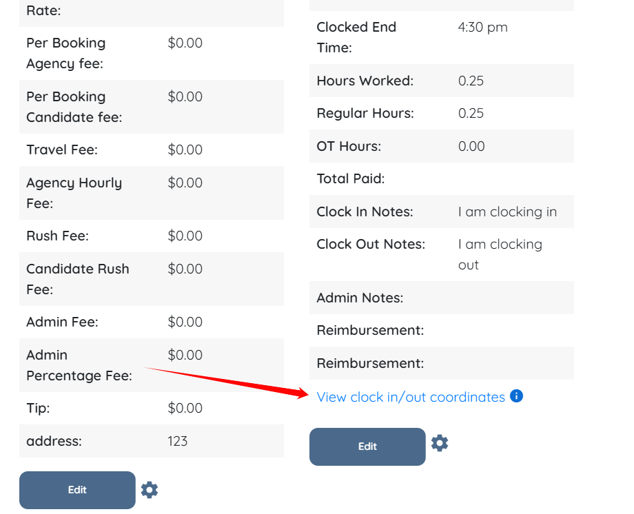 After the assigned candidate completes the job by clocking in and out from the location, you will be able to see the clock in/out coordinates.