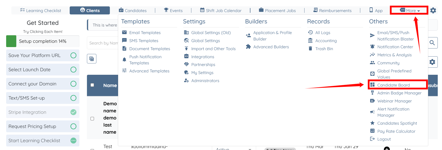 Step 1: Log in to your agent dashboard and click More > Candidate Board, as shown in the screenshot below.