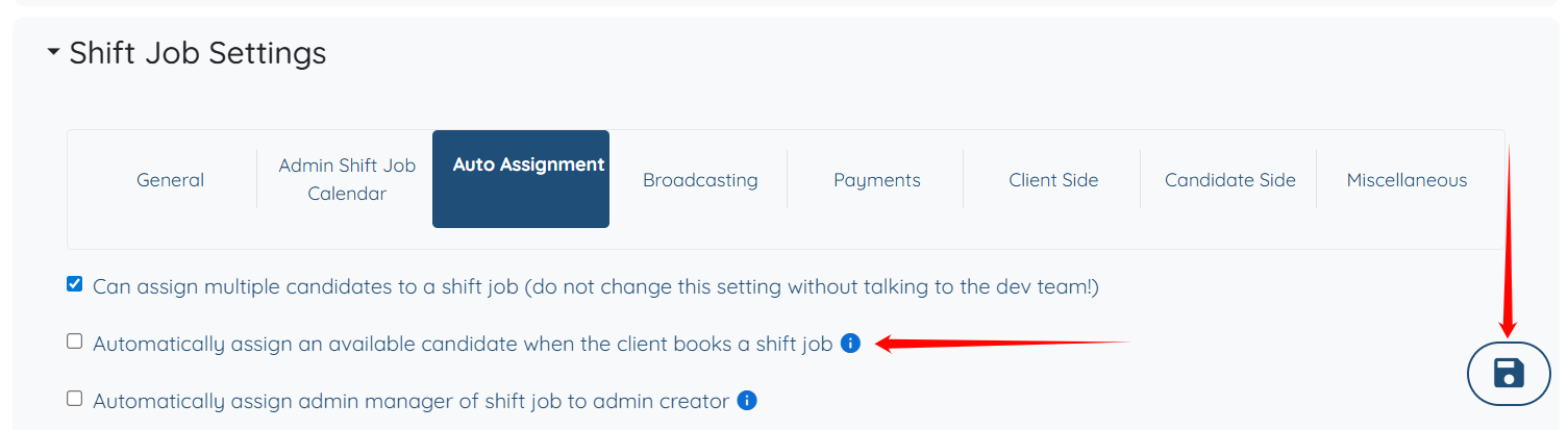 Step 5: Check the “Automatically assign an available candidate when the client books a shift job” checkbox as shown in the screenshot below. Then click the Save icon to proceed.
