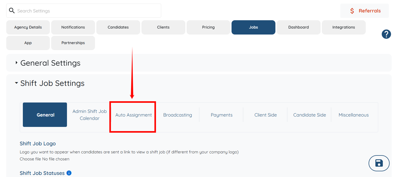 Step 4: Click on the Auto Assignment option under the Shift Job Settings.