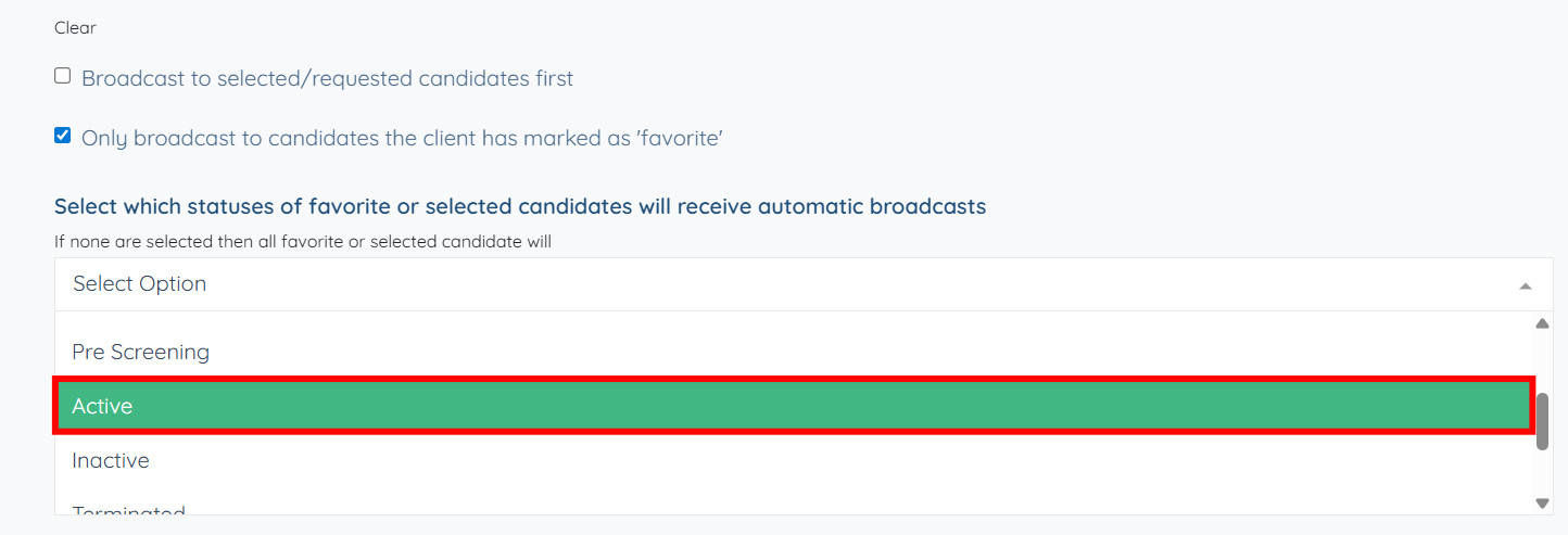 Step 6: Scroll down and check the Only broadcast to candidates the client has marked as ‘favorite’ checkbox to automatically broadcast new bookings only to the candidates the client has marked as favorites.
