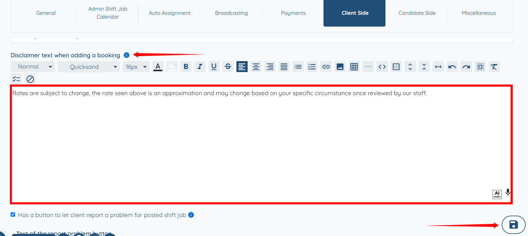 Step 5: Scroll down to the “Disclaimer text when adding a booking” option, and modify the disclaimer text according to your requirements. Once you have made the necessary changes, click the Save icon to continue.