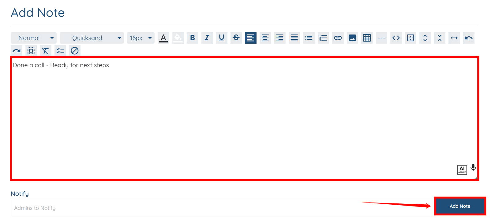 Step 5: Add the required note using the text editor, and then click on the Add Note button to proceed.