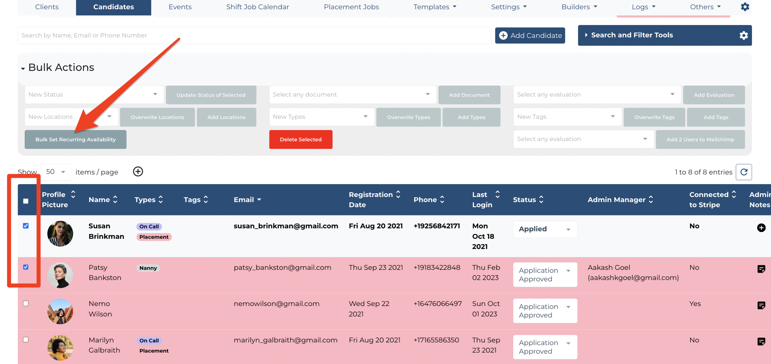 You can multiselect candidates and then use the "Bulk Set Recurring Availability" button