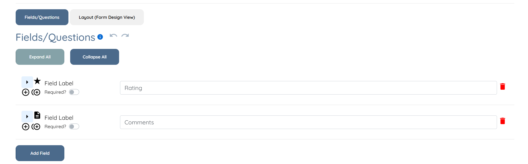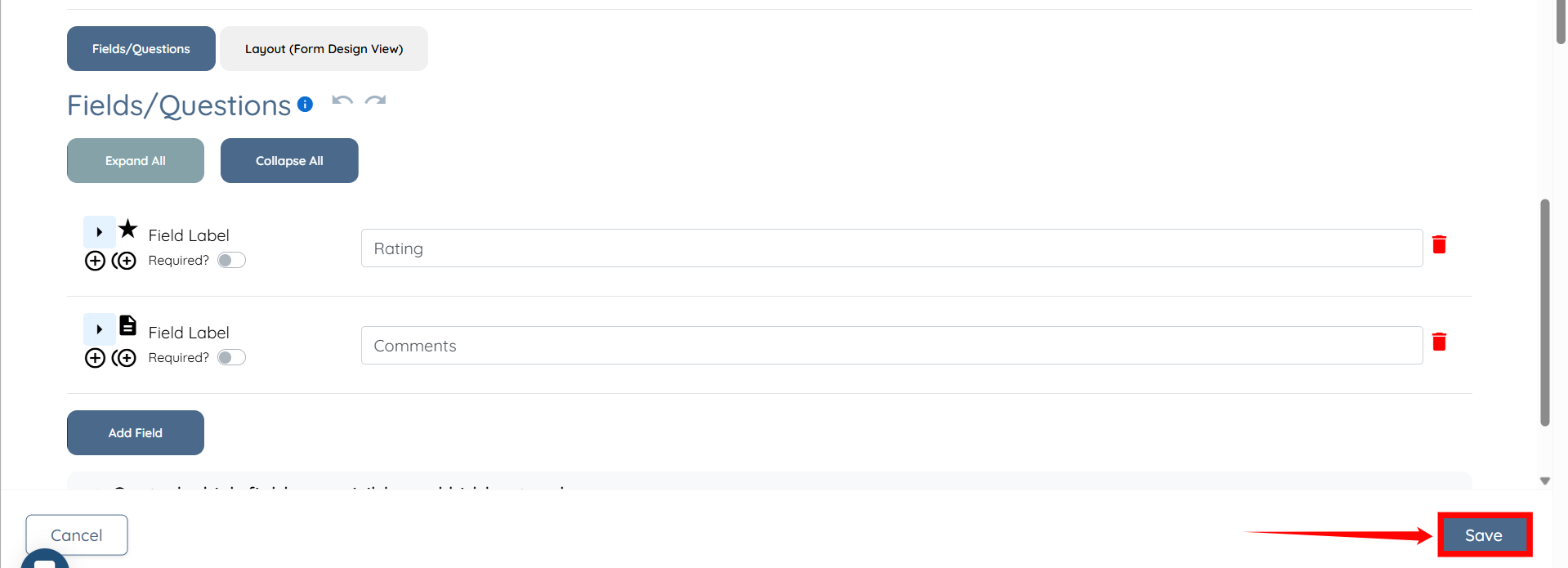 Step 5: Scroll down to view the automatically created fields named Rating and Comments. You can add your own fields and/or remove the automatically created fields.