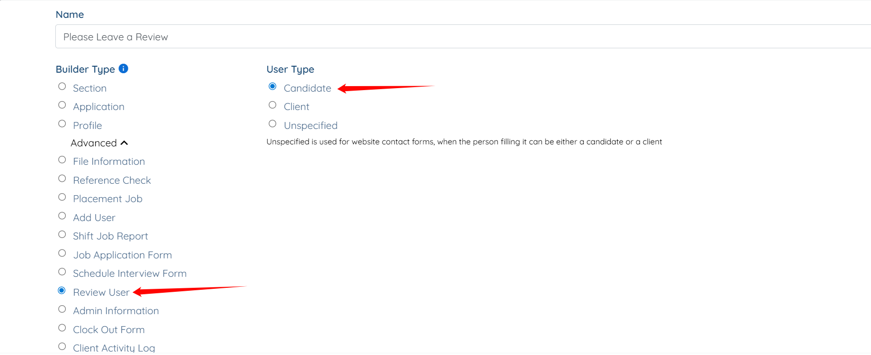 Step 4: Select Candidate as the User Type and Review User as the Builder Type.