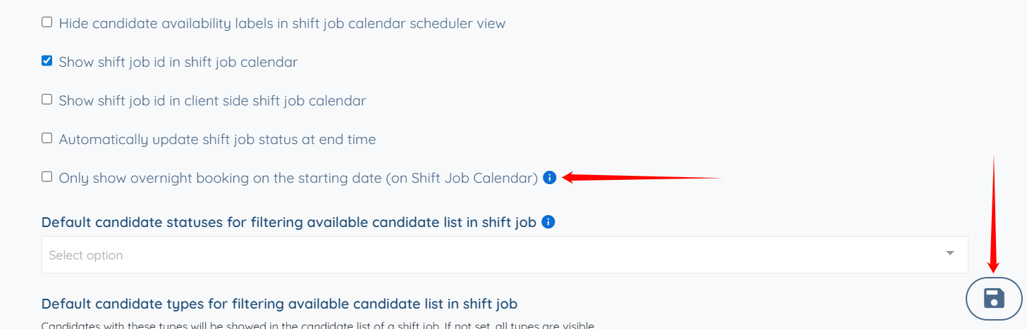 Step 6: Scroll down and make sure that the Only show overnight booking on the starting date (on Shift Job Calendar) checkbox remains unchecked. Then, click the Save icon to proceed.
