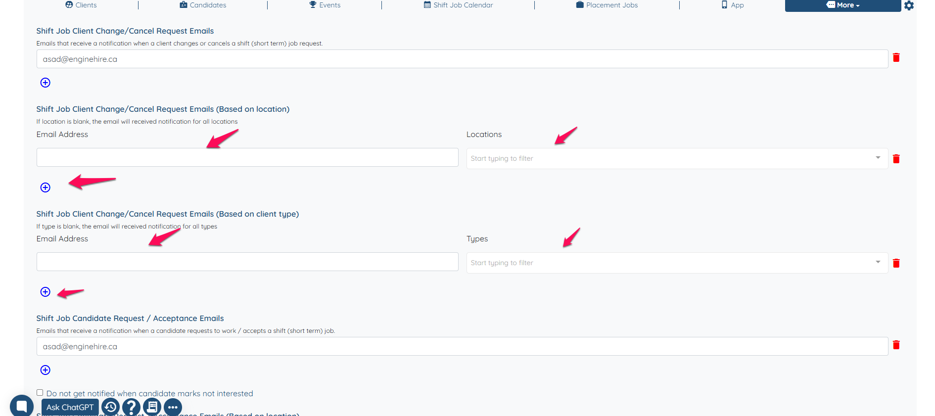 Scroll down, then click the ā+ā icon to add a location or type and enter the email address. You can customize who should receive notifications based on location or type.
