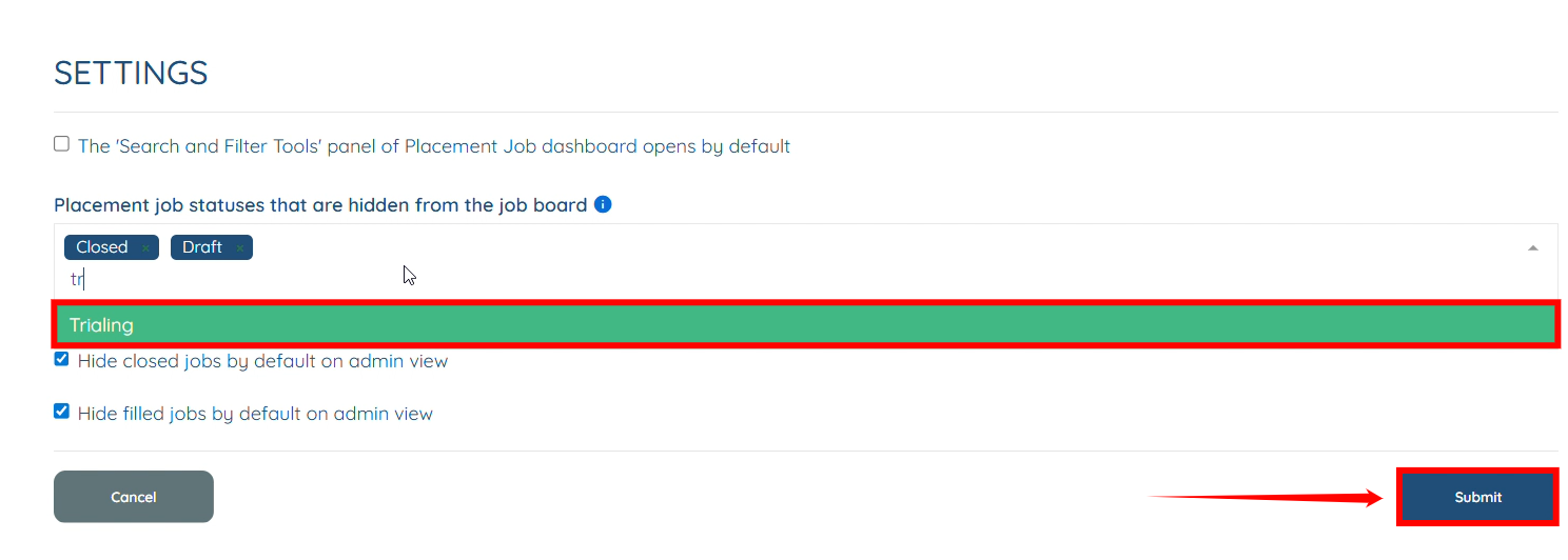 Step 3: In the Placement job statuses that are hidden from the job board field, select the job statuses you want to hide from the job board. Then click the Submit button to proceed.