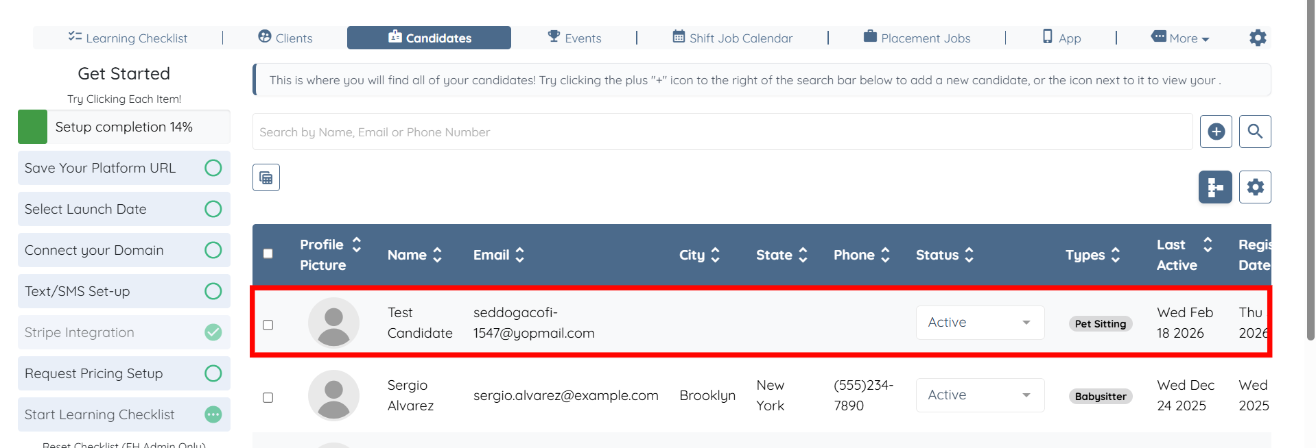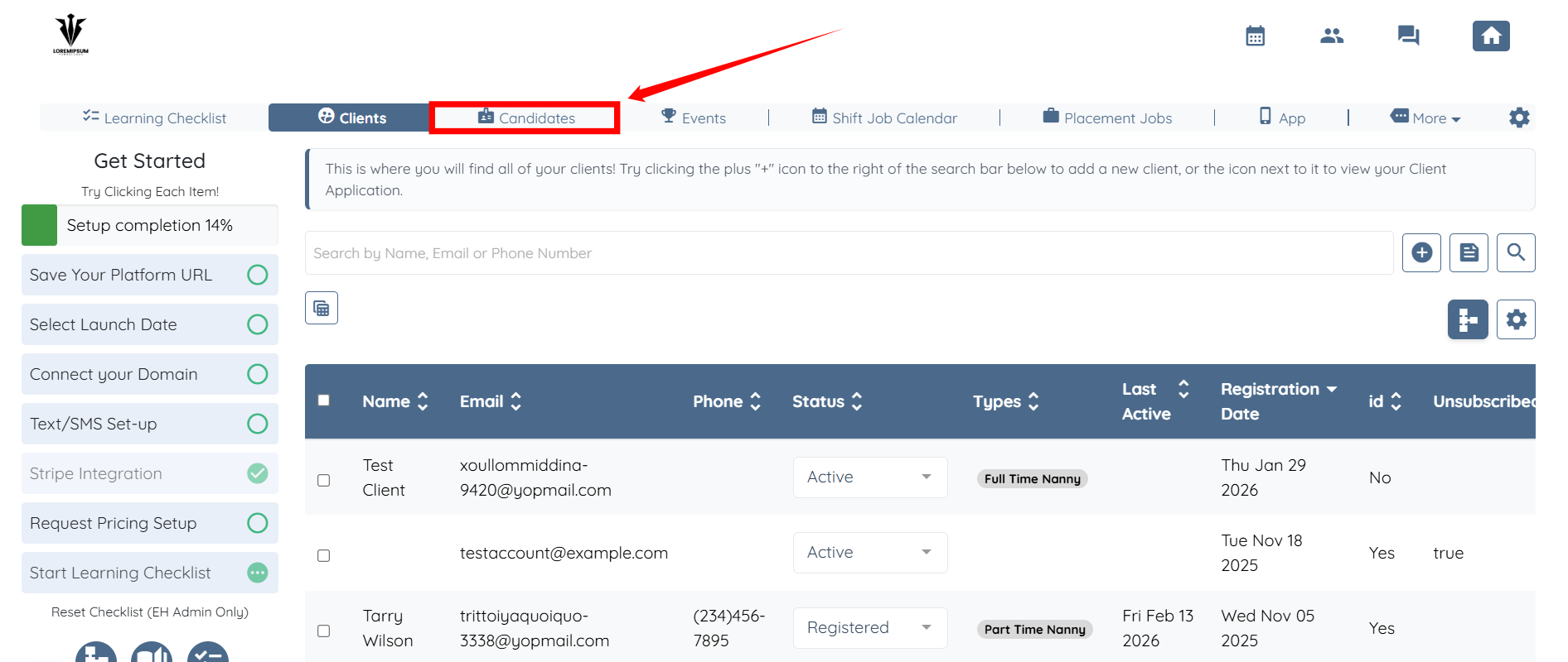 Step 1: Log in to your agent dashboard and click Candidates in the navigation bar.